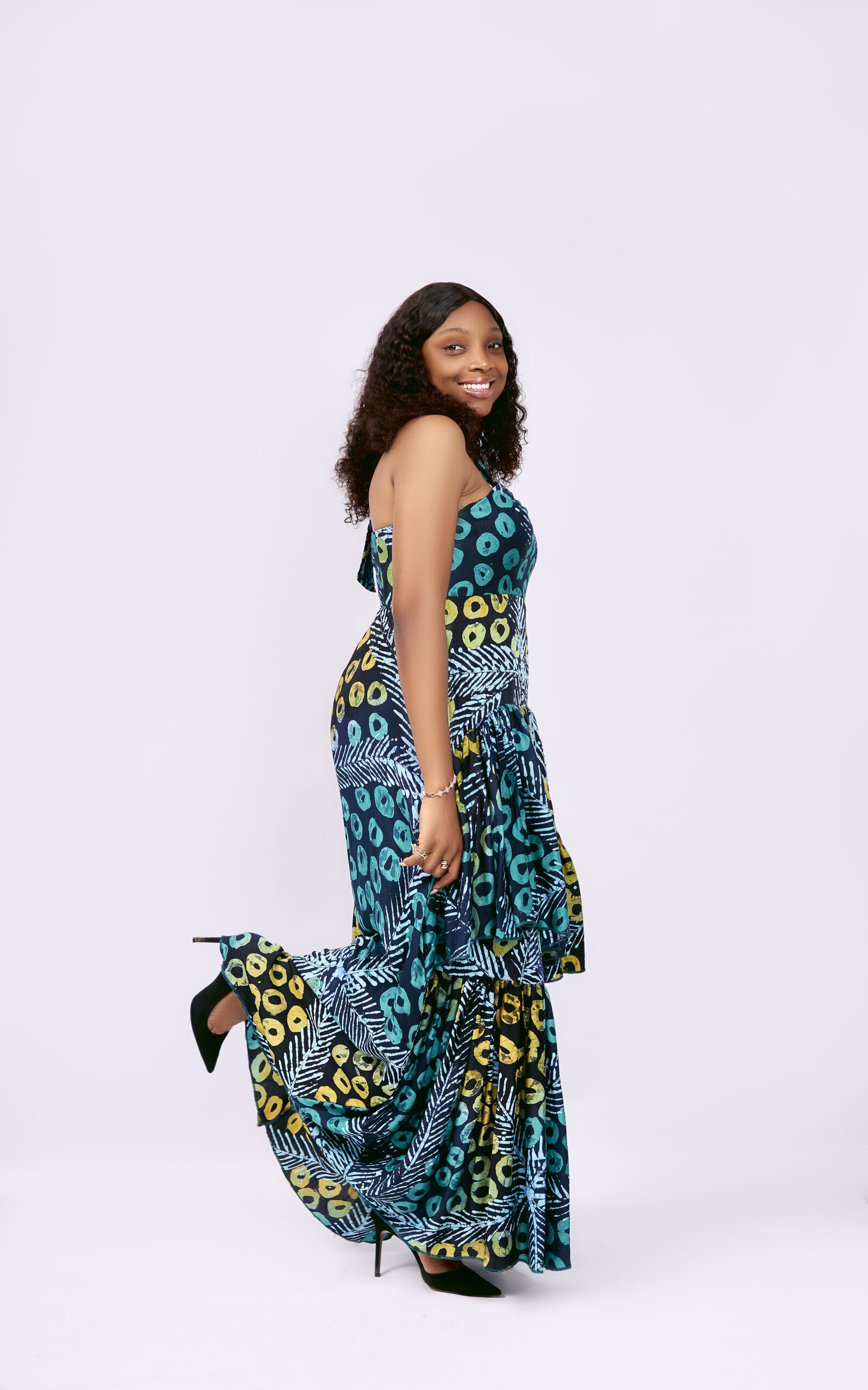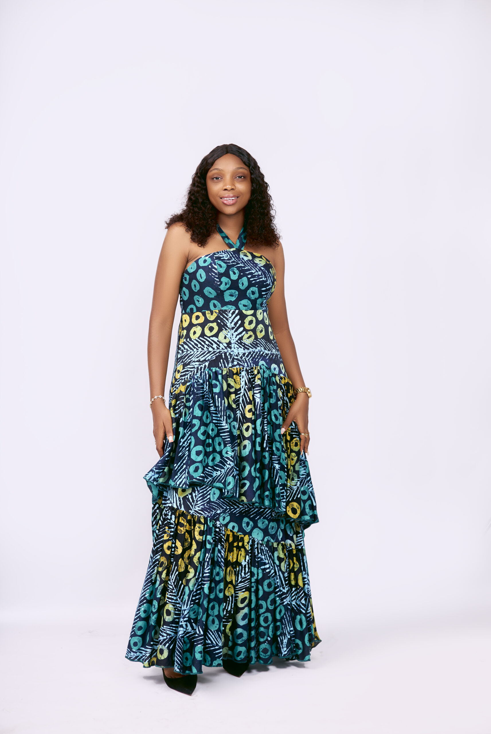 Vibrant adire cotton maxi dress featuring bold mixed prints in turquoise, yellow, and navy with a dramatic tiered skirt silhouette.