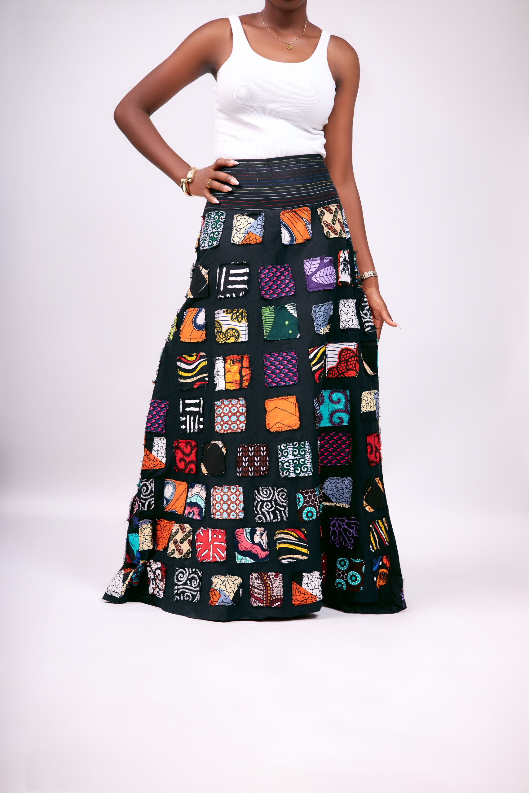 Handcrafted African Ankara patchwork A-line maxi skirt featuring colorful fabric squares on a deep black base. A bold statement piece that blends tradition with modern chic, ideal for casual outings, festive occasions, or stylish everyday wear.