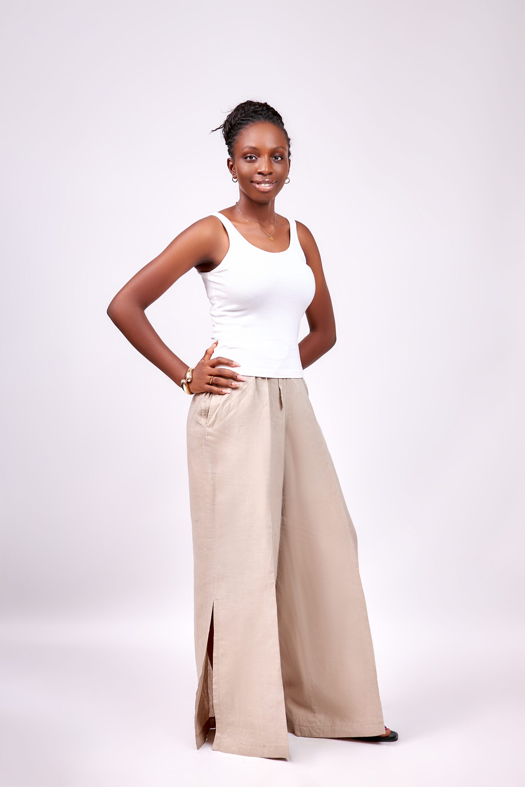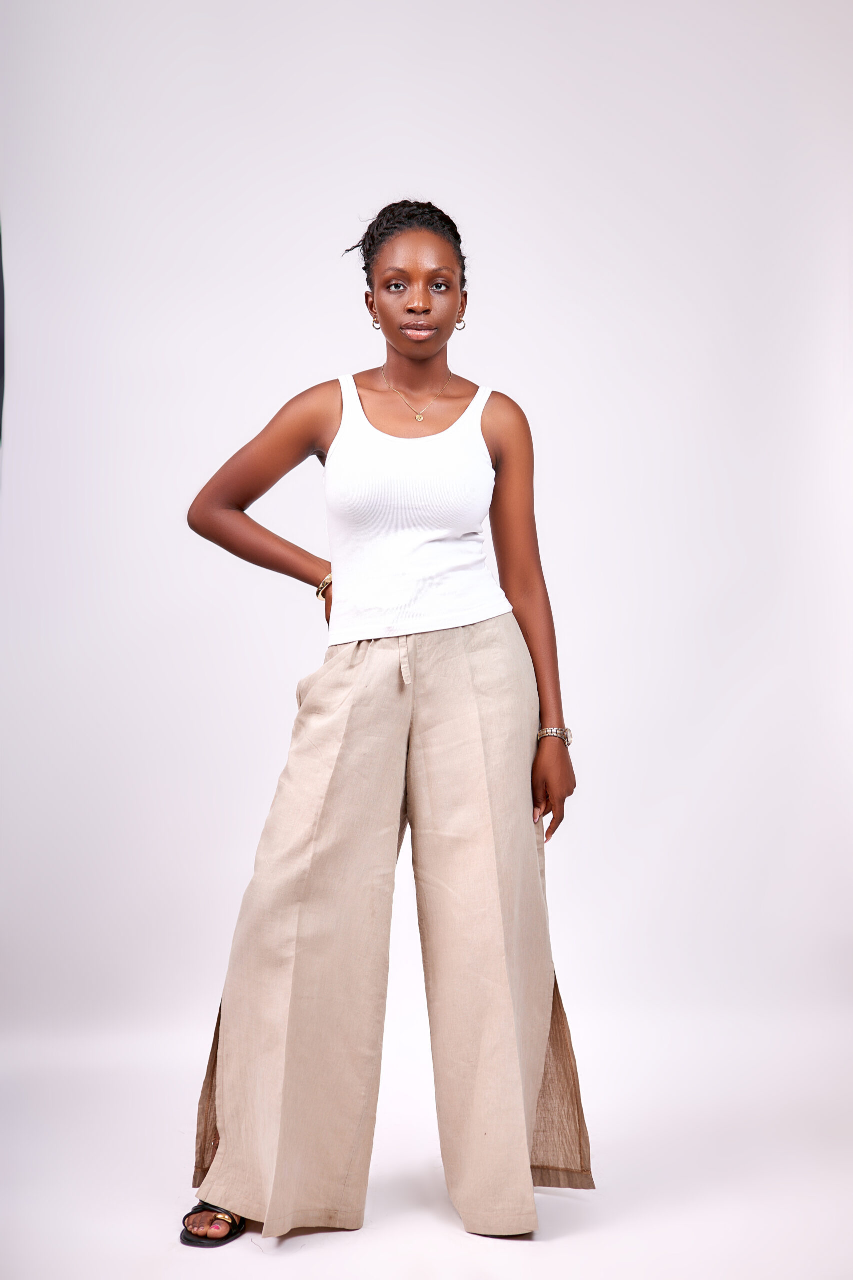 Sophisticated tan linen pants featuring dramatic side slit details that add movement and modern flair to this relaxed A-line silhouette. Crafted from breathable, easy-care linen fabric that keeps you cool and comfortable all day. The flowing wide-leg cut and side slits offer a contemporary edge and ease of movement. Perfect for work, weekend brunches, or elevated casual occasions when paired with a simple tank or tailored blouse.