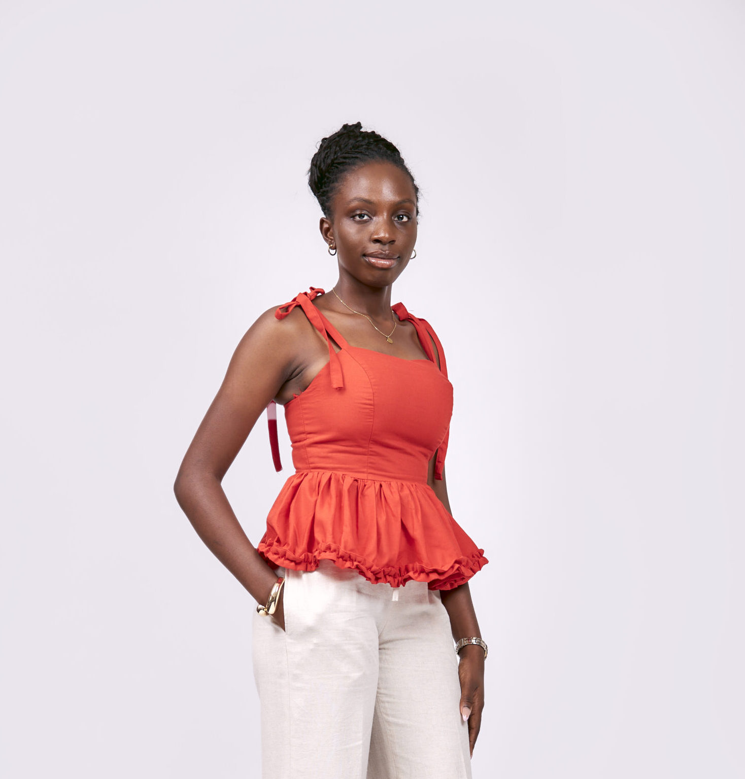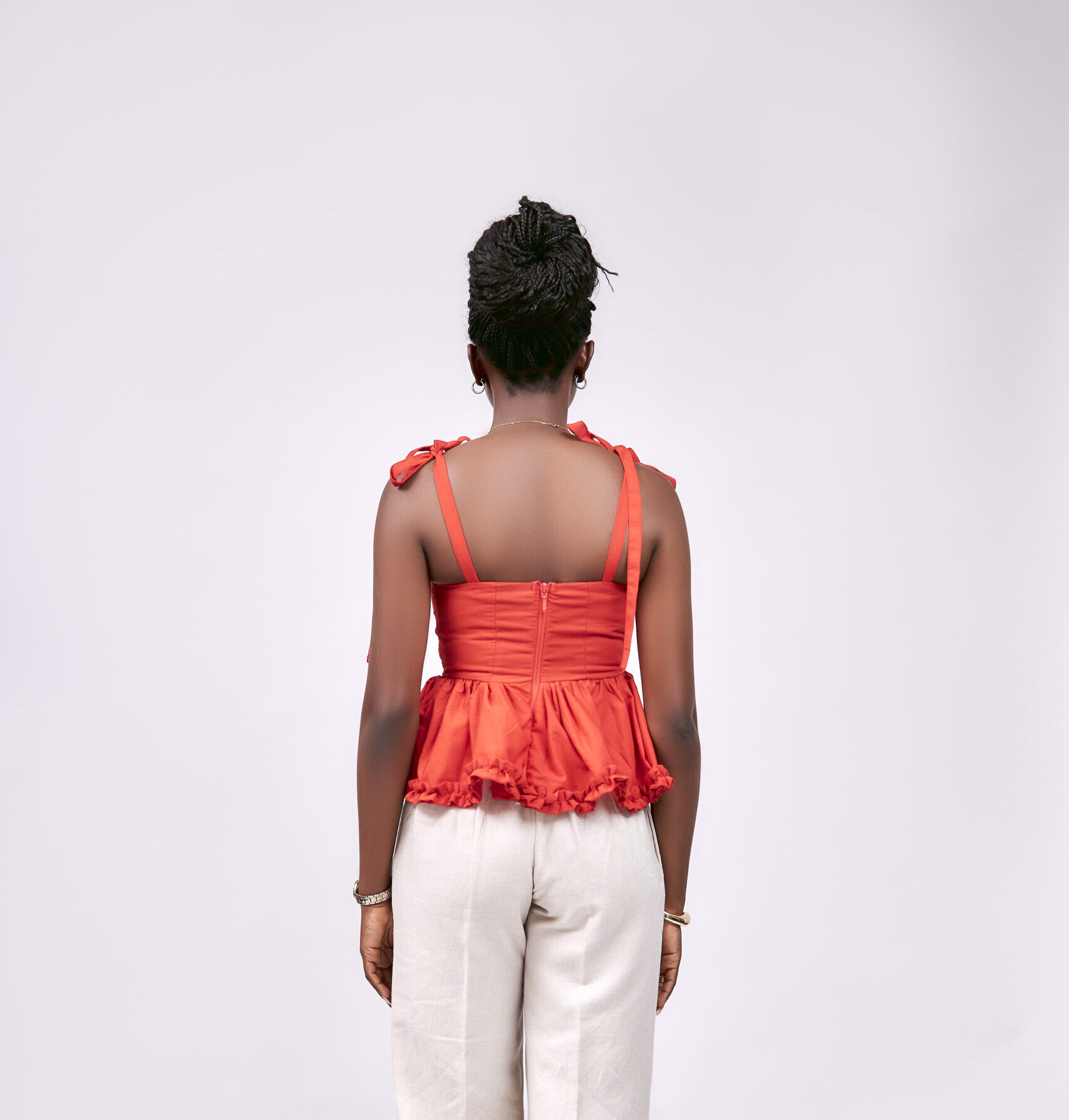 Vibrant red top featuring charming tie straps at the shoulders and a playful ruffle hem that adds movement and feminine flair. The fitted bodice with sweetheart neckline flows into a gathered silhouette. Perfect for pairing with high-waisted trousers or skirts for brunch, picnics, dates, or casual chic occasions.